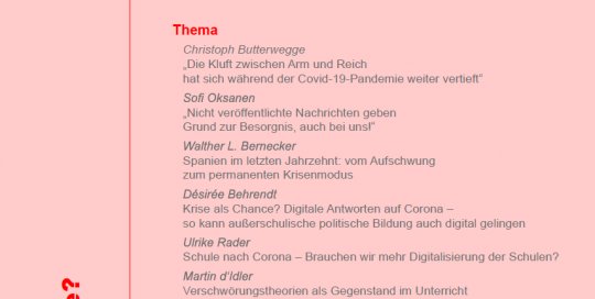 Politisches Lernen 3-4/20 Inhalt Krise(n) als Chance? Thema "Die Kluft zwischen Arm und Reich hat sich während der Covid19-Pandemie weiter vertieft" Christoph Butterberge "Nicht veröffentlichte Nachrichten geben Grund zur Besorgnis, auch bei uns!" Rede zur Verteidigung der Presse- und Informationsfreiheit am 14. Oktober 2019 in Helsinki Sofi Oksanen Spanien im letzten Jahrzehnt: Vom Aufschwung zum [...]