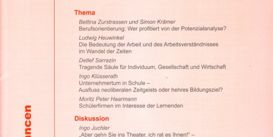Thorsten Obel2021-01-17T12:59:40+00:00Politisches Lernen 1-2/20 Inhalt Arbeit - Beruf - Chancen Thema Berufsorientierung: Wer profitiert von der Potentialanalyse? Bettina Zurstrassen und Simon Krämer Die Bedeutung der Arbeit und des Arbeitsverständnisses im Wandel der Zeiten Ludwig Heuwinkel Tragende Säule für Individuum, Gesellschaft und Wirtschaft Detlef Sarrazin Unternehmertum in Schule - Ausfluss neoliberalen Zeitgeists oder hehres Bildungsziel? Ingo Klüsserath [...]